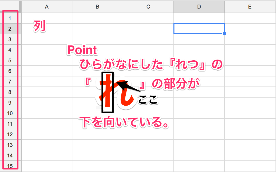 列の覚え方として、ひらがなにした『れつ』の『れ』の棒が下に向いていることで