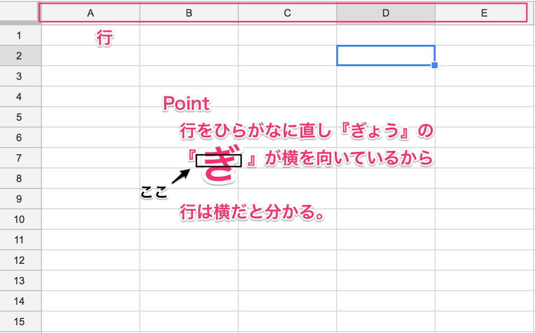 ●横方向に増えていくのが行(英字)『ぎ』が横