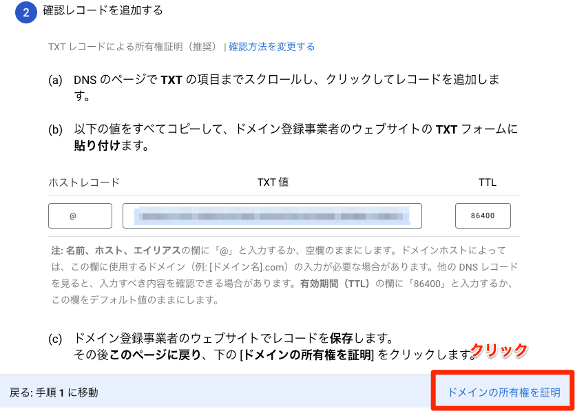 TXT値をクリックするとコピーできますので必要な時にコピーできるように画面は残しておきましょう。
