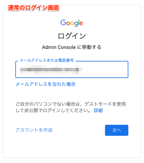 GmailやGoogleでログインするなどで出てくるGoogleへログインする画面です。