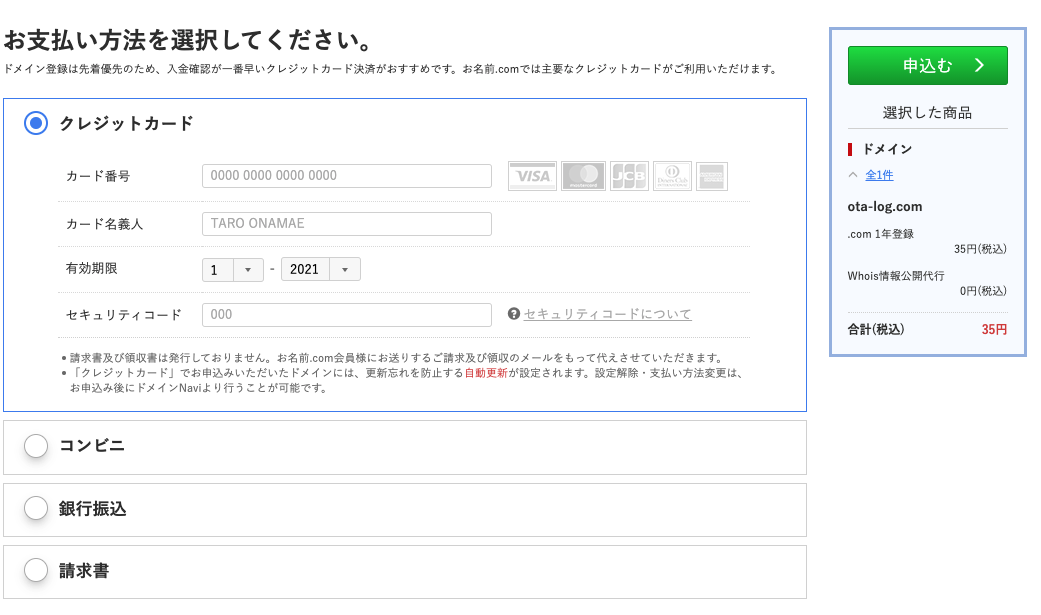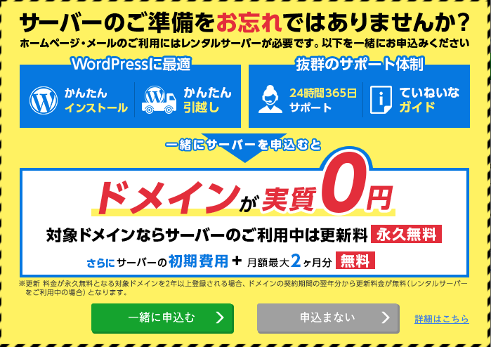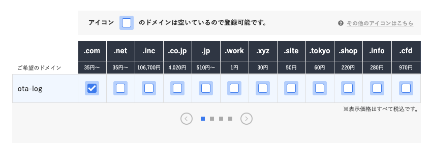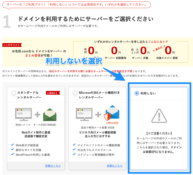 ドメインの人気度によって取得の単価が変わってくるので注意しよう。 - サーバーなどのオプションは基本利用しないを選択
