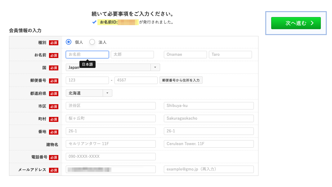 - ユーザー情報入力画面ですので画面に沿って入力して『次へ進む』を押して下さい。