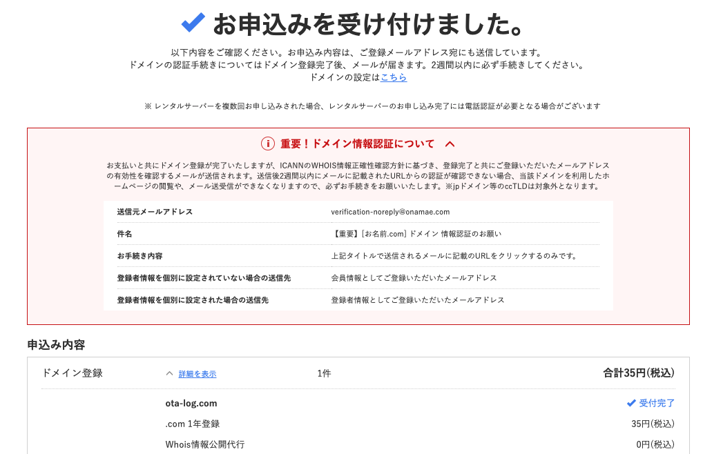 以上、お名前ドットコムでのドメイン取得、Whoisの確認まででした。