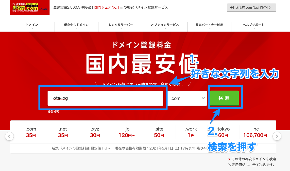 今回はお名前ドットコムを利用したドメイン購入方法を説明します。