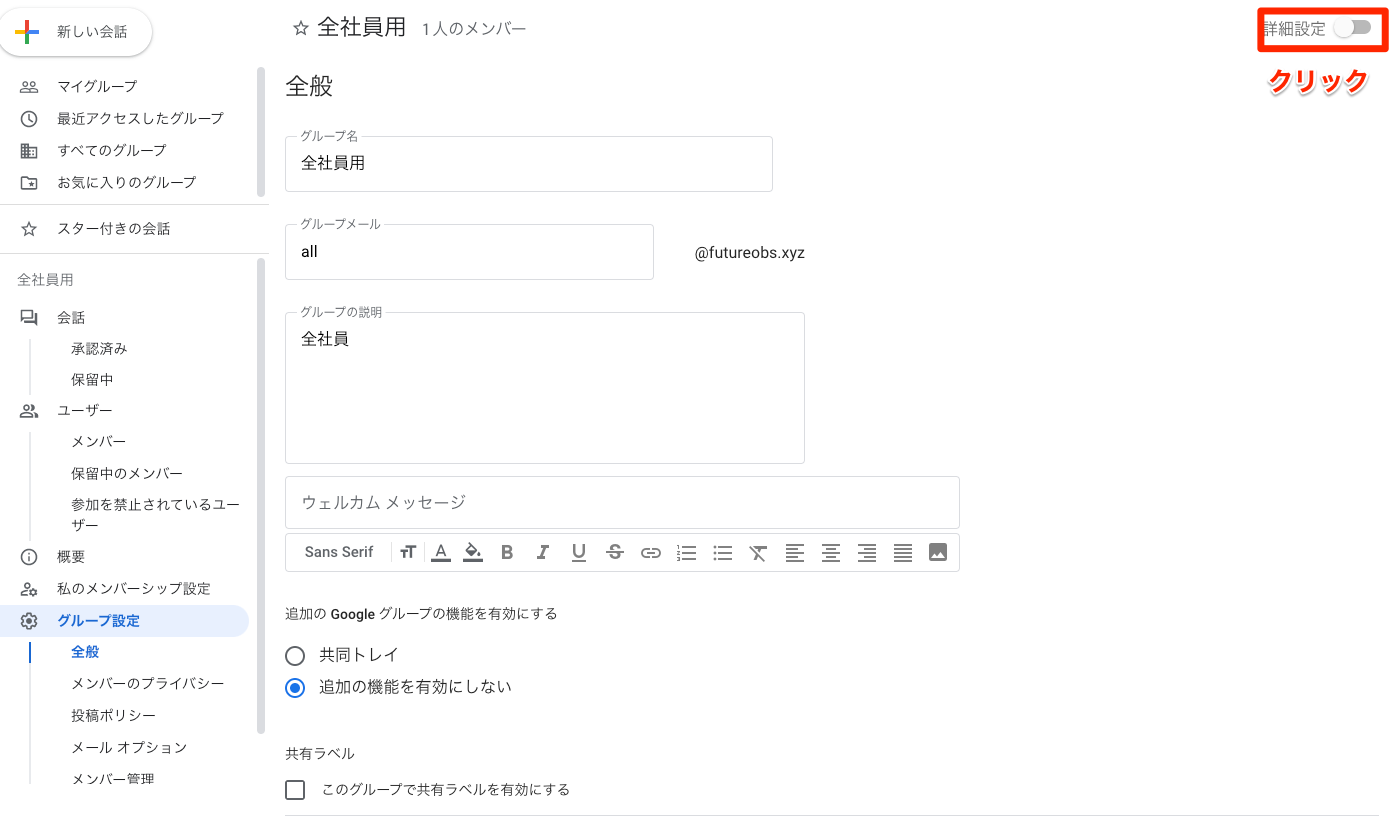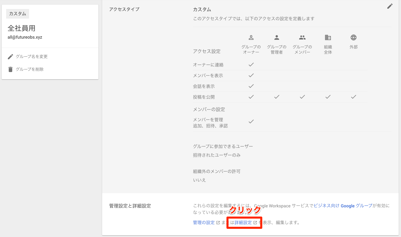グループの詳細設定画面が別タブで開きます。