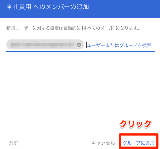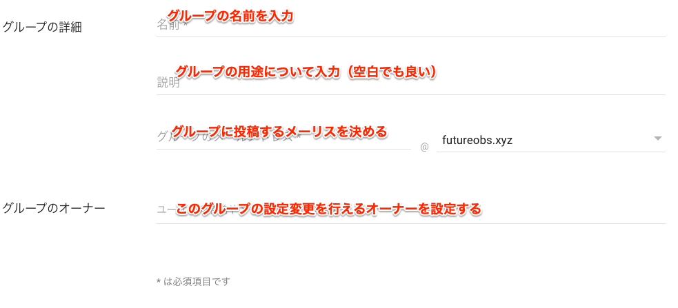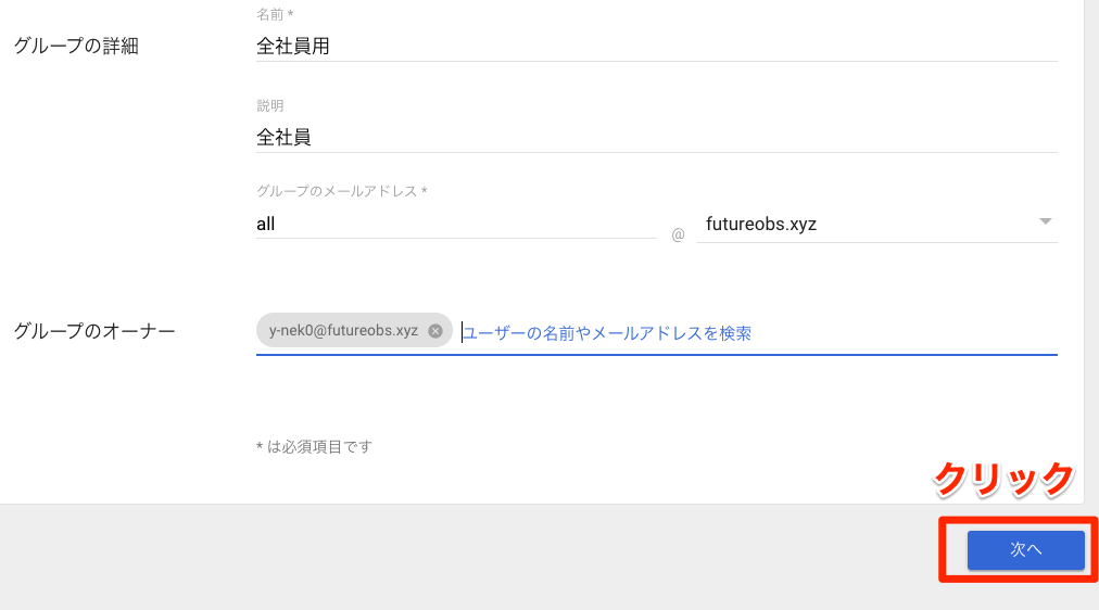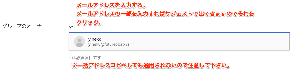 グループのオーナーについてはメールアドレスを入力しますが、入力途中でサジェストで出てくるのでそちらをクリックしてしまえば早いです。