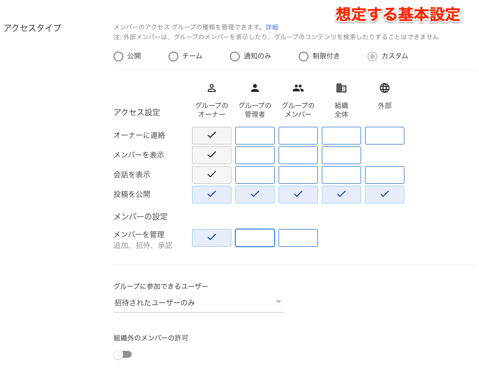 必要に応じて組織外のメンバーを許可する感じで良いかと思います。