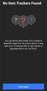 自分の場合はNo Item Trackers Foundと出ているので近くに認知しないAirTagが存在していませんね。