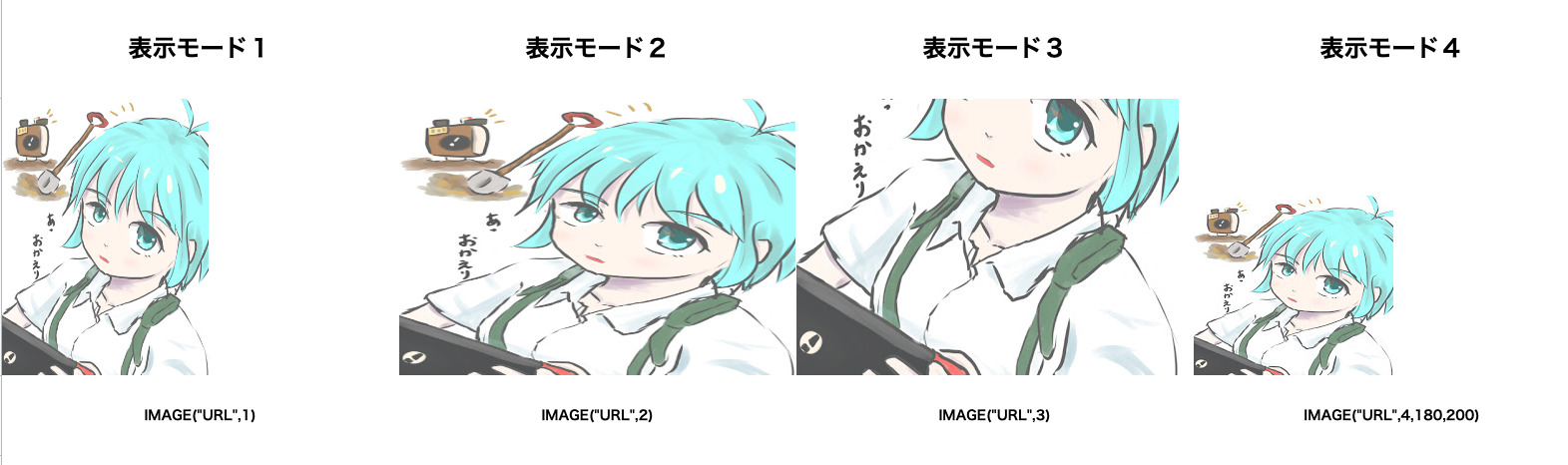 =IMAGE("画像のURL", [表示モード], [高さ], [幅])