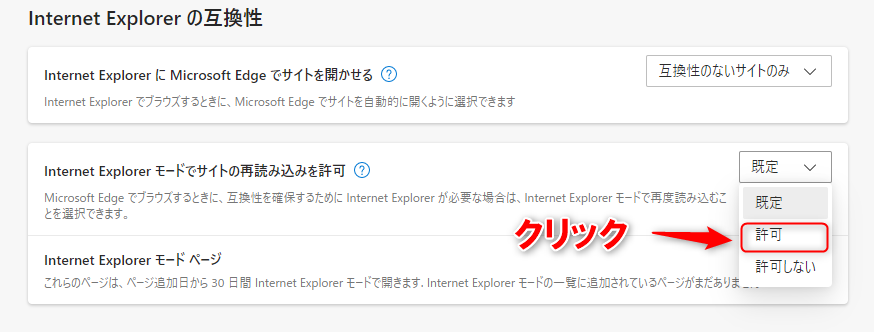 次にInternet Explorerモードでサイトの再読み込みを許可の右にあるプルダウンをクリックします。