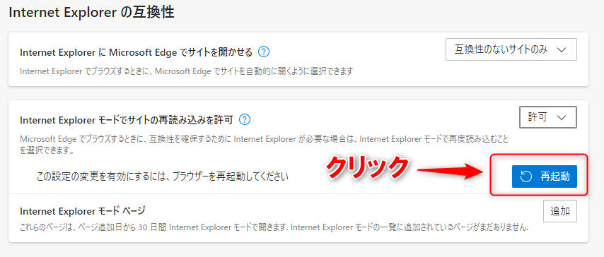 再起動後は以下の様な画面が表示されますので特定ページだけIEモードにしたい場合は