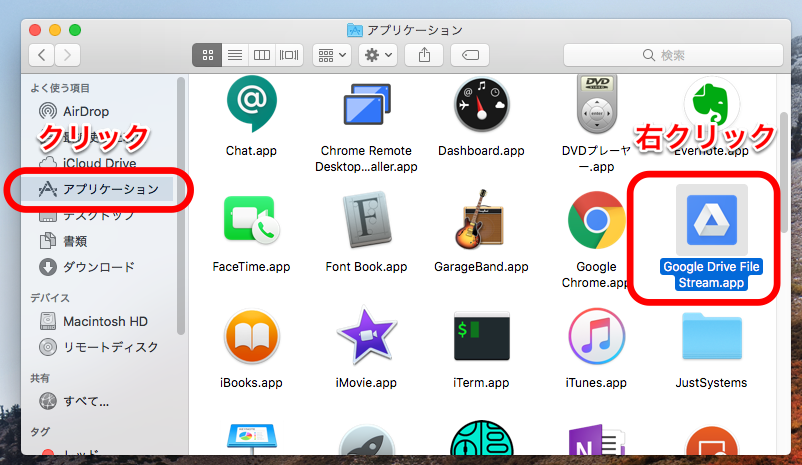 Finderを開きアプリケーション一覧から『Google Drive File Stream.app』を探し